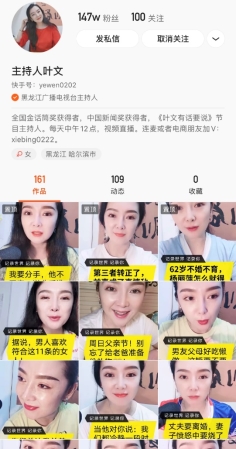 廣播節目《葉文有話要説》,也在快手上重新被認識和喜歡。2019年9月葉文入駐快手以來,共發佈161個作品,累計直播314場,粉絲數147萬。以直播為主,單場直播漲粉最高達20多萬,葉文本人也被視為電台節目轉為視頻直播的一次成功嘗試。