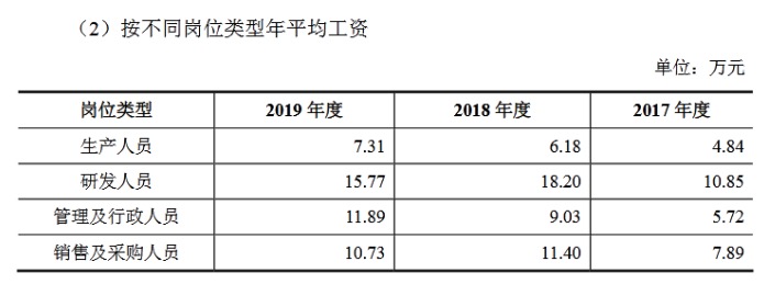 然而蹊蹺的是,在同一份招股書中的第95頁,新亞強介紹各崗位人員年平均工資時又披露,2019年公司研發人員平均工資為15.77萬元,這與研發費中人員人工相差了7.7萬,差異率接近50%。