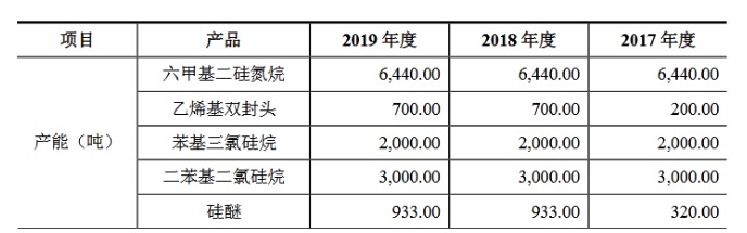 另外,招股書還顯示,近年來,公司產能利用率逐年走低,銷量小幅下滑。2016年至2019年,六甲基二硅氮烷的產能利用率分別為73.58%、66.00%、66.36%和62.44%。銷量分別為5194.30噸、4784.89噸、4130.41噸和4153.51噸。