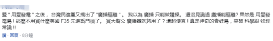 解放軍軍機出現在台灣附近空域,台媒每每報道,均聲稱台軍進行了所謂的“廣播驅離”,有網友在台媒評論區留言諷刺稱,在“用愛發電”之後,民進黨又搞出了“廣播驅離”,那麼不用買什麼美國戰鬥機了,買廣播器就夠用了。