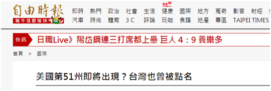 報道稱,美國眾議院當天表決通過讓華盛頓特區成為51州,系美國曆史上首次,“由於美國強大的經濟實力與影響力,‘成為美國51州’在國際間成為一種亦真亦假的議題,先前更有民眾在白宮請願網站上發動聯署,盼美國買下台灣。”
