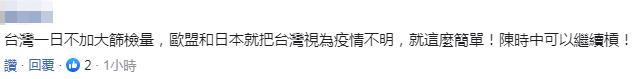 有網民則認為(歐盟)打臉民進黨當局的吹噓。有人喊話民進黨當局,不要再吹牛了,(台灣)根本沒有普篩資料,別人怎麼會相信?台灣一日不加大篩檢量,台灣就會被視為疫情不明。↓