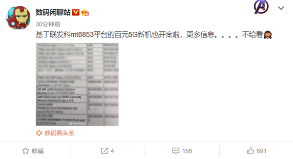 6月26日消息,知名數碼博主@數碼閒聊站曬圖爆料稱:基於聯發科MT6853平台的百元5G新機已開案。