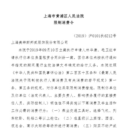 上海市黃浦區人民法院發佈的限制消費令上顯示,法院於2019年09月10日立案執行申請人林華康、毛衞紅申請執行你單位房屋租賃合同糾紛一案,因你單位未按執行通知書指定的期間履行生效法律文書確定的給付義務。法院按照相關規定,對美邦服飾採取限制消費措施,限制美邦服飾及胡佳佳不得實施高消費及非生活和工作必需的消費行為。
