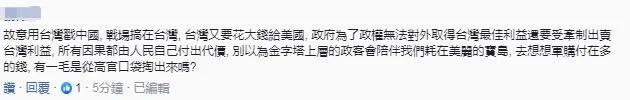 還有網民認為,美國是故意用台灣戳大陸, 戰場搞在台灣, 台灣又要花大錢給美國, 台當局為了政權,無法對外取得台灣最佳利益,還要受牽制出賣台灣利益, 所有因果都由民眾自己付出代價。他表示,別以為金字塔上層的政客會陪伴我們耗在美麗的寶島, 去想想軍購付在多的錢, 有一毛是從高官口袋掏出來嗎?↓