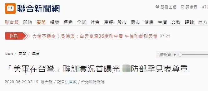 據台灣《聯合報》6月29日報道,數十年來美軍到台協助台軍進行訓練,從未曝光實際情況,台軍也向來列為機密。 台灣《聯合報》29日説,美國陸軍第1特種作戰羣去年2月發佈名為“EXCELLENCE”(卓越)的宣傳片,片長44秒,並將其公佈在官方網站與社交媒體上,宣傳片開頭有近十秒時間,播放了美軍特種部隊在台灣與台軍特戰部隊共同執行室內攻堅、戰傷救護、人員撤離等訓練的畫面,多名美軍教官搭配一名身着台軍迷彩服的特戰官兵,在台軍營舍中模擬進行戰術搜索、攻堅,並搭乘“黑鷹”直升機撤離。片中直升機上的台軍標誌一閃而過,顯示美軍位置在台灣。