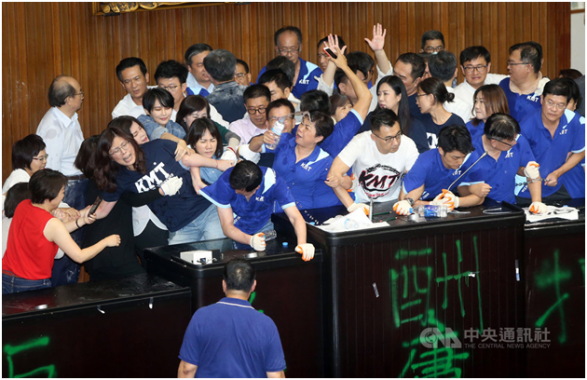 因反對蔡英文提名陳菊擔任“監察院長”,國民黨“立委”6月28日突襲佔領台“立法院”會場,不到一天時間遭民進黨清場。29日上午,民進黨“立委”破門進入會場,與國民黨“立委”爆發肢體衝突,雙方互相拉扯、推擠,現場一片混亂。