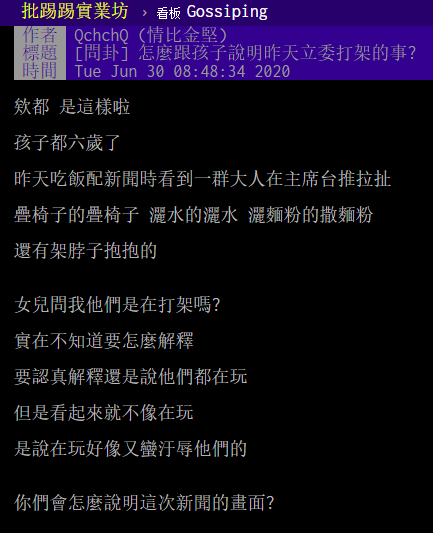 今天(30日)上午,一位島內網友在島內網友常用的論壇“批踢踢實業坊”(簡稱PTT)上發帖,詢問“怎麼跟孩子説明29日‘立委’打架的事”。