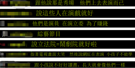 網友紛紛留言,有人提供了這樣的説明:“就説這些人在演戲就好”,“他們是演員,在演‘立委’,為了賺錢”,這是“綜藝節目”。↓