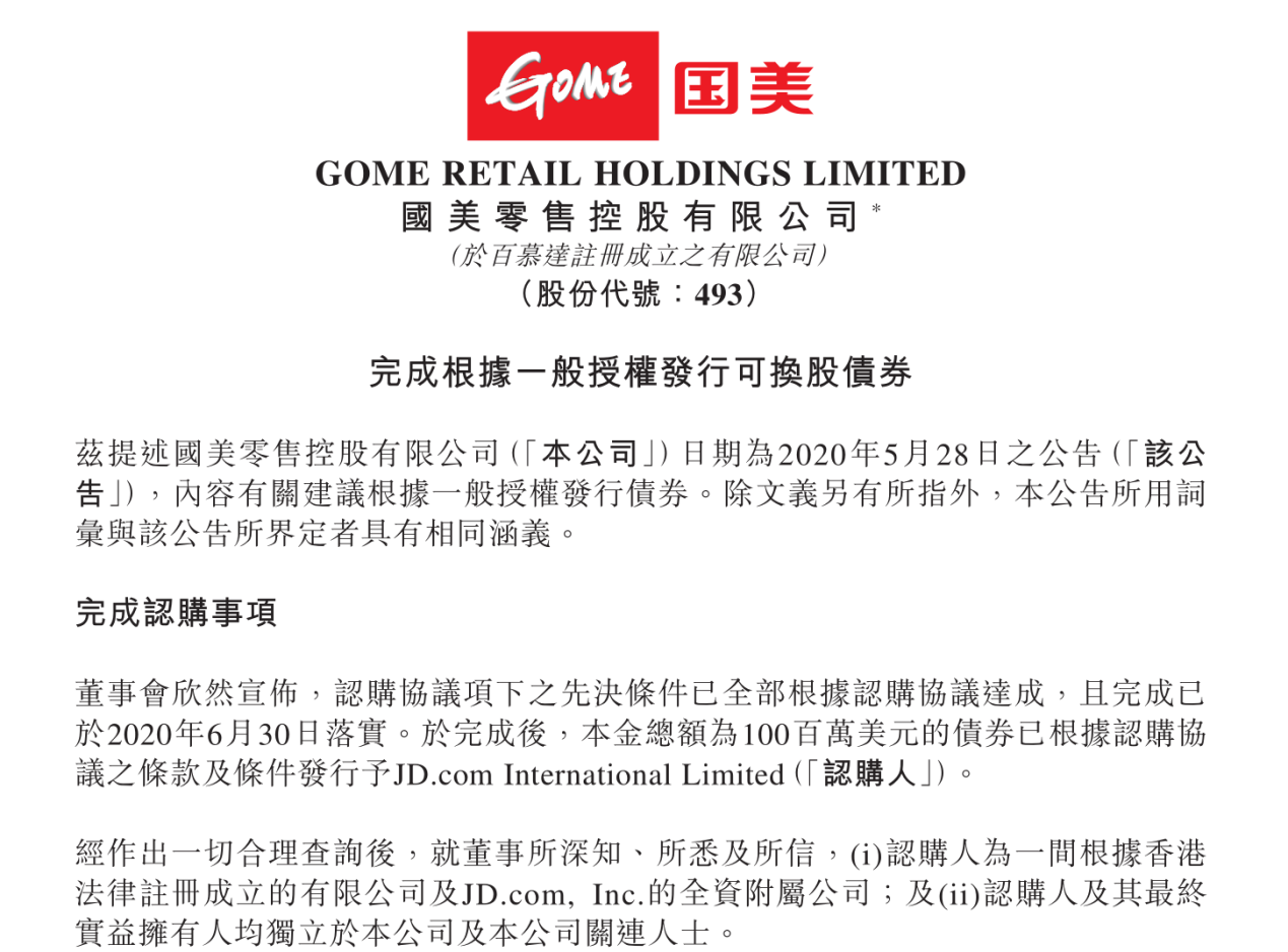 國美零售京東正式完成可轉債交割