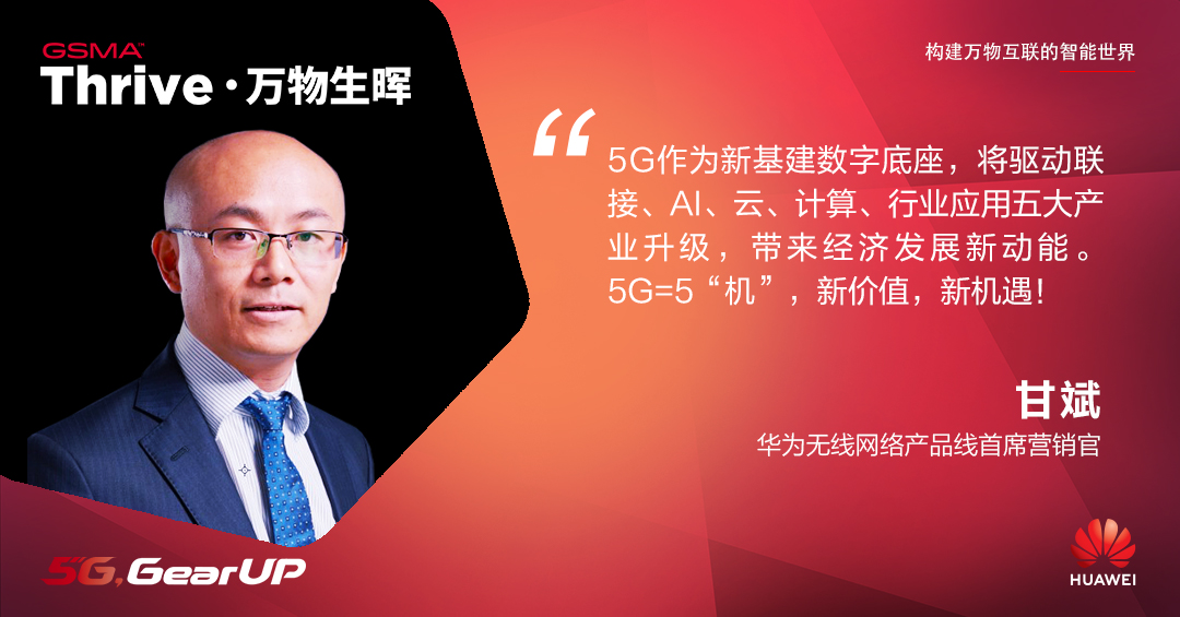 【環球網科技綜合報道】6月30日,在GSMA舉辦的新基建與企業數字化論壇上,華為無線網絡首席營銷官甘斌發表了《5G=5“機”,新價值,新機遇》的主題演講。會上,甘斌表示,“5G作為新基建數字底座,將驅動聯接、人工智能、雲、計算、行業應用五大產業升級,帶來經濟發展新動能。”