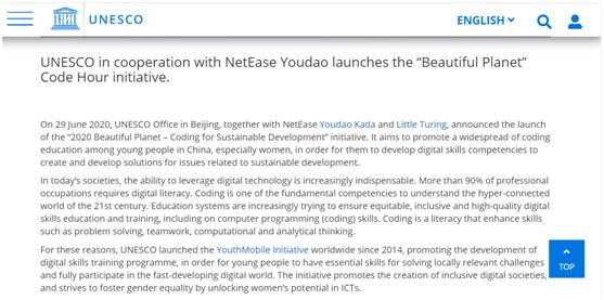 基於共同的目標理念,聯合國教科文組織駐華代表處攜手有道少兒編程品牌卡搭和小圖靈,在教科文組織“青年手機計劃”的框架下,共同發起 “2020美麗星球——為可持續發展目標編程公益行動”。