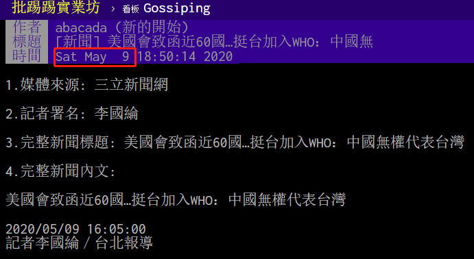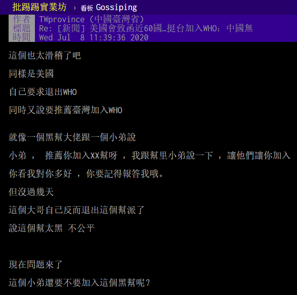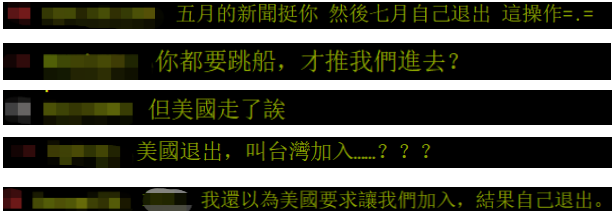 美國總統特朗普7日正式致函聯合國,告知自明年7月6日起退出世界衞生組織(WHO)。8日,有網友翻出親綠的“三立新聞網”5月9日發在島內網友常用的論壇“批踢踢實業坊”(簡稱PTT) 上的一個新聞:“美國會致函近60國挺台加入WHO,中國無權代表台灣”,不少網友在這條舊聞下留言告知“美國走了”,並討論美國退出世界衞生組織讓台灣有點尷尬。