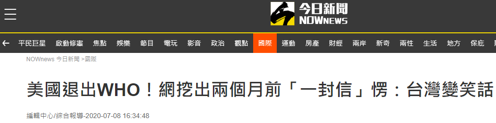 台灣“今日新聞網”8日對此也以“美國退出WHO!網友挖出兩個月前‘一封信’:台灣變笑話”為題進行報道。
