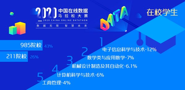 中國數據馬拉松大賽(China Datathon)於2018年由前程無憂與Correlation One公司聯合推出,之前已成功舉辦兩屆線下決賽。第三屆中國數據馬拉松大賽(China Datathon)於2020年5月開啓,創新採取初賽+決賽全程在線模式。這一瞄準中國未來頂尖數據人才的賽事在為期兩個月的初賽環節中,吸引了超過5100名在職人員及學生參加。通過在線數據科學評估,最終社會組35人、學生組63人通過嚴格篩選,脱穎而出入圍在線總決賽。學生組決賽選手中,有69%來自985、211院校,電子信息科學與技術專業的選手佔12%;社會組中,目前從事數學分析/數據科學家、金融財務、軟件開發/運維等工作的選手人數排名前三。