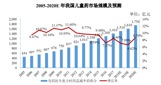 我國是世界兒童大國,由於生育率降低,近10年來我國兒童人數呈下降趨勢,但國內兒童絕對數量依然龐大。隨着全面二胎政策的實施,以及國內生活水平的提高,居民對兒童用藥的質量要求和價格承受能力上升,兒童用藥消費需求依然旺盛。數據顯示到2018年我國兒童藥市場規模已突破1500億元,增速保持在8.5%左右,預計到2020年將達到1750億元。如下圖5: