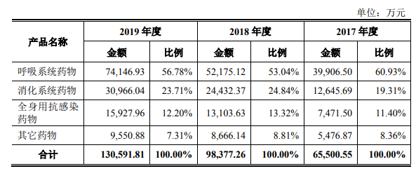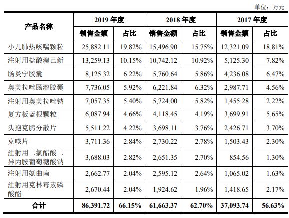 上表中的產品為葫蘆娃藥業持續在銷售且為公司帶來重要收入來源的主要產品,這三年的收入合計金額分別為37.093.74萬元、61,663.37萬元及86,391.72 萬元,佔同期主營業務收入總額的比重分別為56.63%、62.70%及66.15%,銷售金額及佔收入比重明顯持續上升。