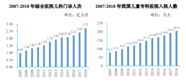 從終端醫院治療情況來看,隨着國內對兒童健康的日益關注,綜合醫院兒科門急診量增長迅速,兒科門診人次及佔比逐年提高,2007年至2018年我國綜合醫院兒科門診人次由9,798萬人次上升至27,164萬人次,佔比由8.22%上升至10.72%;兒童專科醫院的入院人數也逐年增加,由2007年78.12萬人上升至2018年205.93萬人,體現了我國社會對兒科疾病旺盛的醫療產品和服務需求。如下圖6: