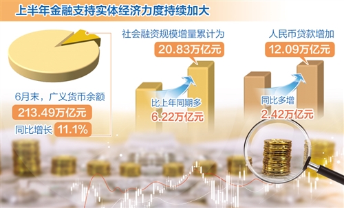 有3組數據均明顯高於去年同期水平:6月末,廣義貨幣(M2)餘額213.49萬億元,同比增長11.1%,已經連續4個月保持兩位數增速;上半年社會融資規模增量累計為20.83萬億元,比上年同期多6.22萬億元;上半年人民幣貸款增加12.09萬億元,同比多增2.42萬億元。