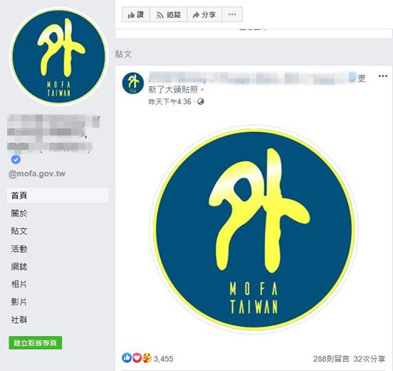 台外事部門臉書10日更新頭像圖示,改以藍綠色為底、圖樣保留“外”字的部門徽章樣式,文字則以“MOFA TAIWAN”表示。“中時電子報”報道稱,李彥秀11日在臉書發文提到,早在今年3月,台外事部門已經兩次利用全球疫情肆虐的機會,將外事部門原本的大頭貼換成了“聽診器”以及“Taiwan Can Help”。