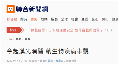 《聯合報》報道稱,台軍有軍官表示,生物疾病緊急狀態的演練,就在“漢光演習”開始的第一天舉行,地點在高雄的退輔會岡山榮家。除了台防務部門自身的軍醫與化學兵,高雄榮總與義大醫院也會加入。