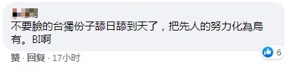 對於民進黨當局將長谷川謹介稱為“台灣鐵道之父”一事,有網友在蔡正元臉書評論區留言稱,“‘台獨’分子舔日舔到天了,把先人的努力化為烏有。”