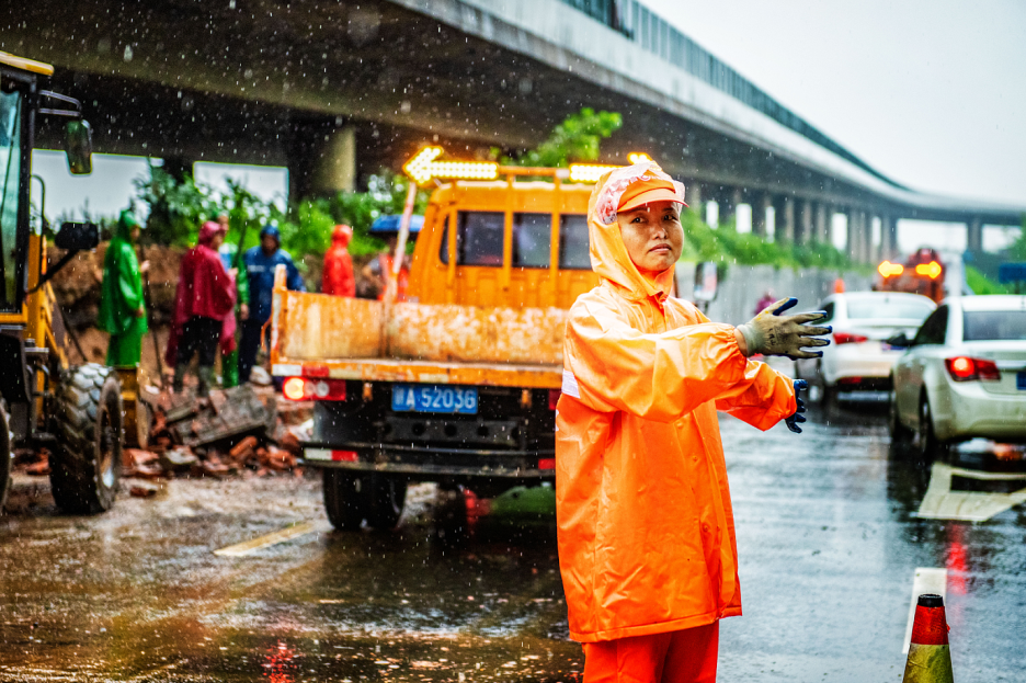 富春江畔,傾盆大雨中,一羣交通人扛起鐵鍬,快速裝沙袋,沒有一個退縮、沒有一句抱怨。
