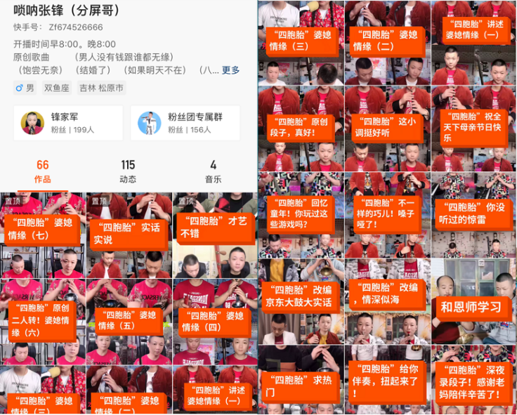 如今張峯輾轉來到快手做起了主播(快手暱稱:嗩吶張鋒(分屏哥);快手ID:340367072),以分屏的形式,一人玩起了樂隊。用張峯的話説,“兜兜轉轉,好像又回到了夢開始的地方”。張峯當初“典當”的嗩吶夢,正一點點被尋回。