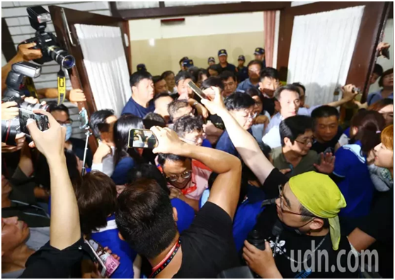 而“議場”內,主席台已經被“藍委”佔領,質詢台、備詢台也被推翻。