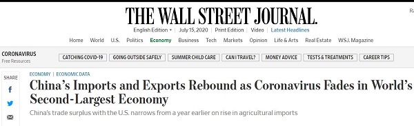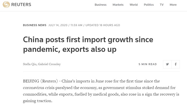 7月14日公佈的海關數據顯示,中國經濟正逐漸擺脱第一季度GDP急劇收縮6.8%的影響。中國的出口表現並沒有像一些分析師擔心的那樣受到全球經濟放緩的嚴重影響。