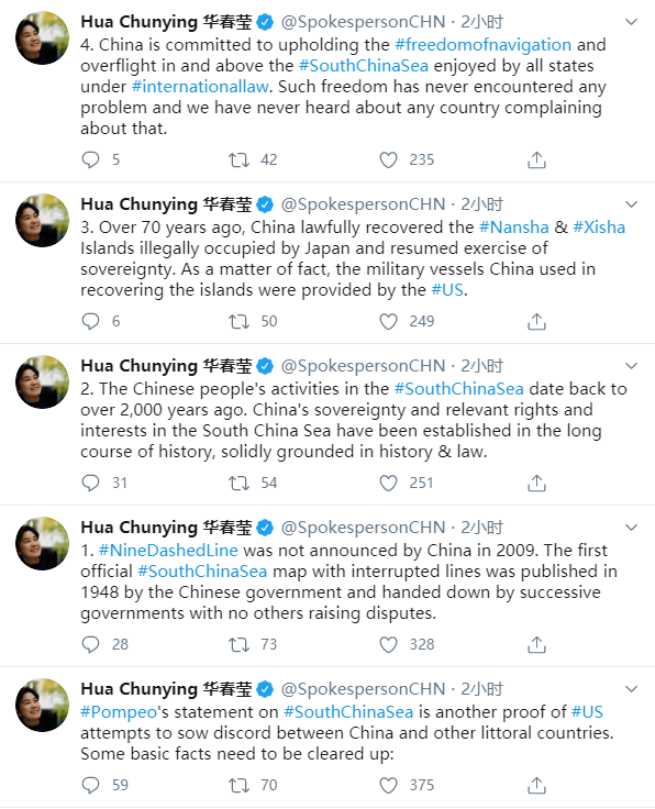7月14日,中國外交部發言人華春瑩在社交平台列出10點事實回擊美國國務卿蓬佩奧所謂的涉南海聲明。 (圖源:Twitter)