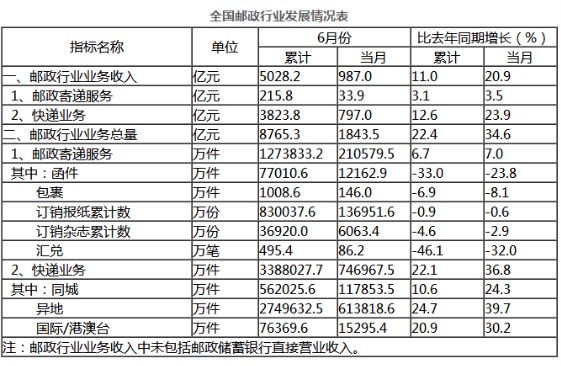 其中,6月份,全國快遞服務企業業務量完成74.7億件,同比增長36.8%;業務收入完成797億元,同比增長23.9%。郵政服務業務總量完成232.5億元,同比增長17.3 %;郵政寄遞服務業務量完成21.1億件,同比增長7%;郵政寄遞服務業務收入完成33.9億元,同比增長3.5%。