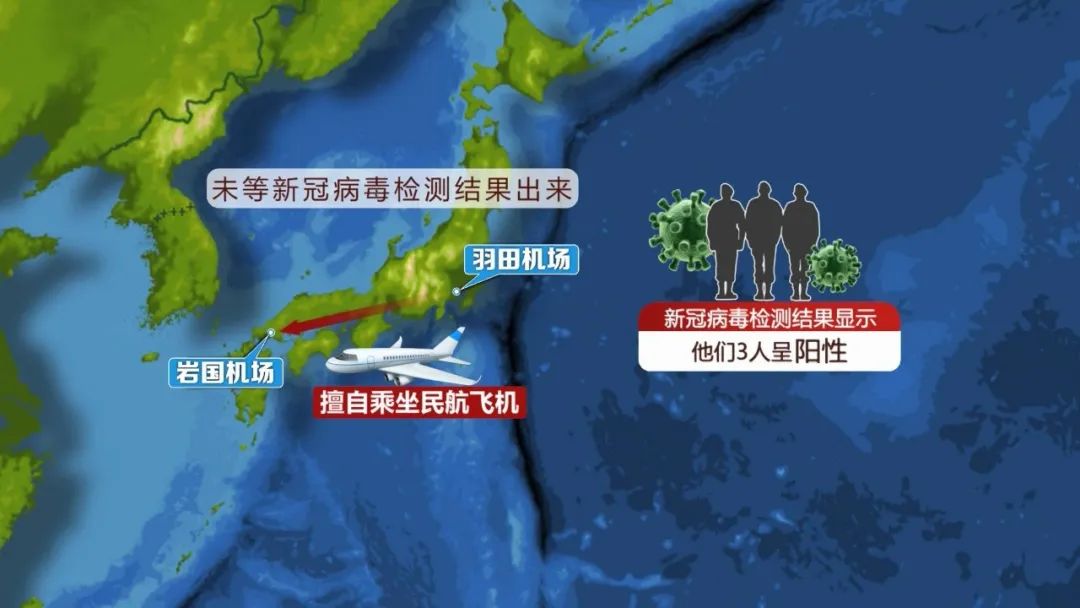 據日媒報道,這3人都是美軍巖國基地相關人員,12日由美國入境日本。他們在羽田機場接受檢測時申報稱,“不使用公共交通工具,將租車出行”。但還沒等新冠病毒檢測結果出來,他們卻已經擅自乘坐民航飛機前往巖國機場。