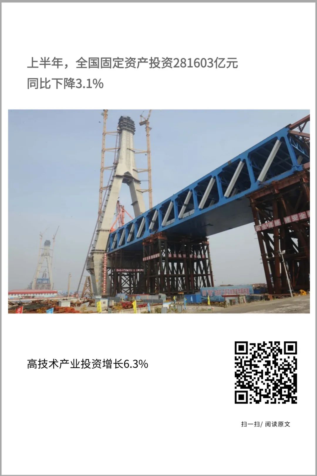 上半年,全國固定資產投資(不含農户)281603億元,同比下降3.1%,降幅比1-5月份收窄3.2個百分點,比一季度收窄13.0個百分點。