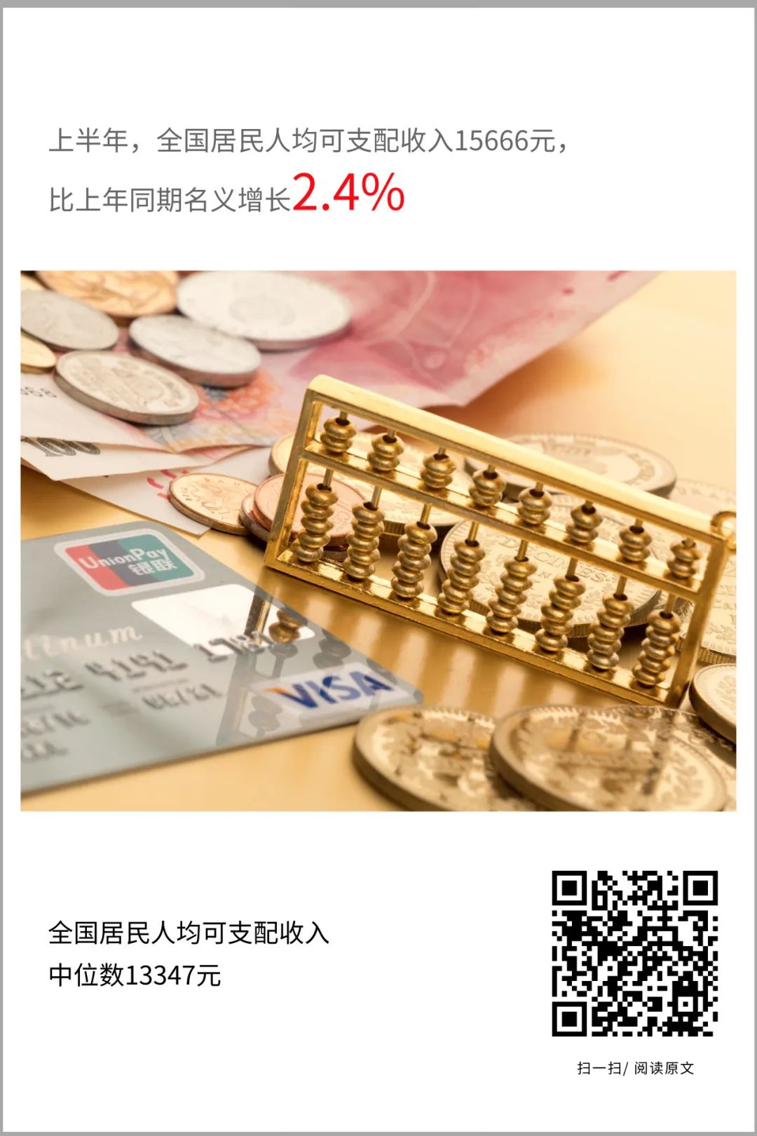 上半年,全國居民人均可支配收入15666元,同比名義增長2.4%,增速比一季度加快1.6個百分點;扣除價格因素實際下降1.3%,降幅收窄2.6個百分點。按常住地分,城鎮居民人均可支配收入21655元,名義增長1.5%,實際下降2.0%;農村居民人均可支配收入8069元,名義增長3.7%,實際下降1.0%。從收入來源看,全國居民人均工資性收入同比名義增長2.5%,經營淨收入下降5.1%,財產淨收入增長4.2%,轉移淨收入增長8.2%。城鄉居民人均收入比值2.68,比上年同期縮小0.06。全國居民人均可支配收入中位數13347元,同比名義增長0.5%。