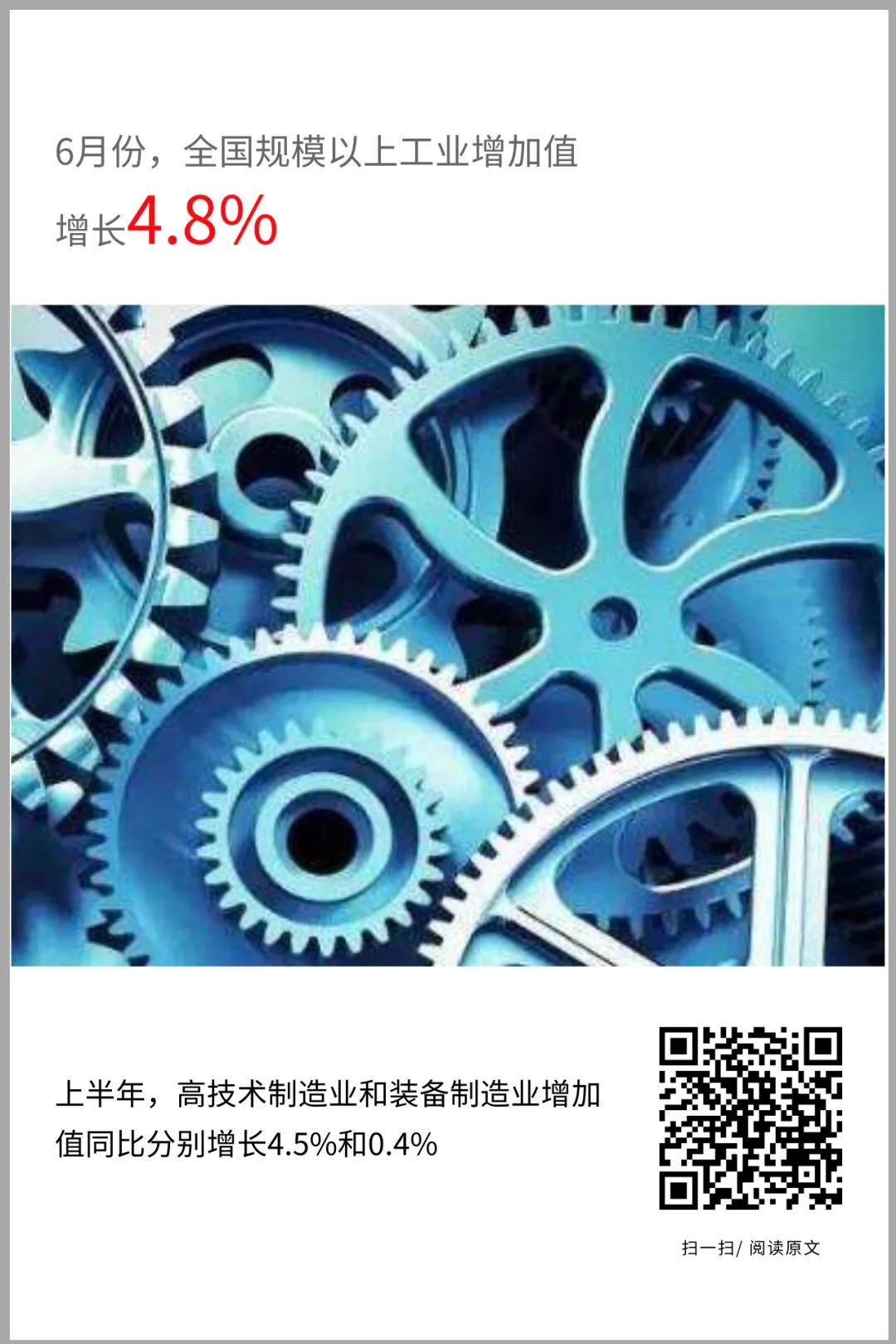 上半年,高技術製造業和裝備製造業增加值同比分別增長4.5%和0.4%;其中6月份分別增長10.0%和9.7%。部分工程機械類和新產品產量增長較快。上半年,挖掘、剷土運輸機械,集成電路,工業機器人,載貨汽車產量同比分別增長16.7%、16.4%、10.3%、8.4%。1-5月份,全國規模以上工業企業實現利潤18435億元,同比下降19.3%,降幅持續收窄;其中,5月份利潤總額由4月份同比下降4.3%轉為增長6.0%。6月份,中國製造業採購經理指數為50.9%,比5月份上升0.3個百分點,連續4個月位於臨界點之上。