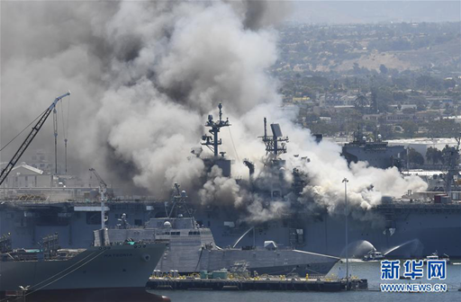 7月12日,美國加利福尼亞州聖迭戈海軍基地起火冒出濃煙。 停泊在加利福尼亞州聖迭戈海軍基地的一艘美軍兩棲攻擊艦12日發生火災。新華社/美聯
