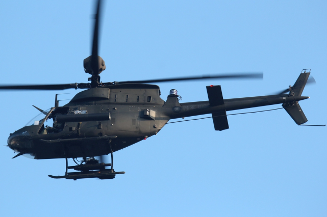 據台灣“中央社”報道,台“陸軍航特部”一架OH-58D戰搜直升機昨天墜毀,機上兩名飛行員重傷不治,附近民宅監視器拍下了事發瞬間畫面,可以看見直升機從空中急速墜地,隨後爆炸起火。