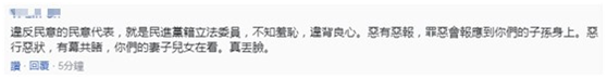 也有網友稱,“違反民意的民意代表,就是民進黨籍‘立法委員’,不知羞恥,違背良心。惡有惡報,罪惡會報應到你們的子孫身上。惡行惡狀,有目共睹,你們的妻子兒女在看。真丟臉。”