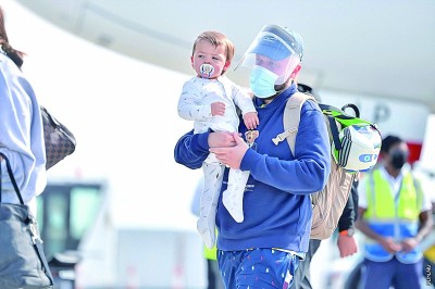 據當地媒體報道,一架載有100多名遊客的卡塔爾航空公司班機7月15日清晨抵達馬爾代夫維拉納國際機場,標誌着馬爾代夫因新冠肺炎疫情關閉的邊境正式開放。圖為一名戴着口罩的旅客抱着孩子走在馬爾代夫維拉納國際機場內。新華社發