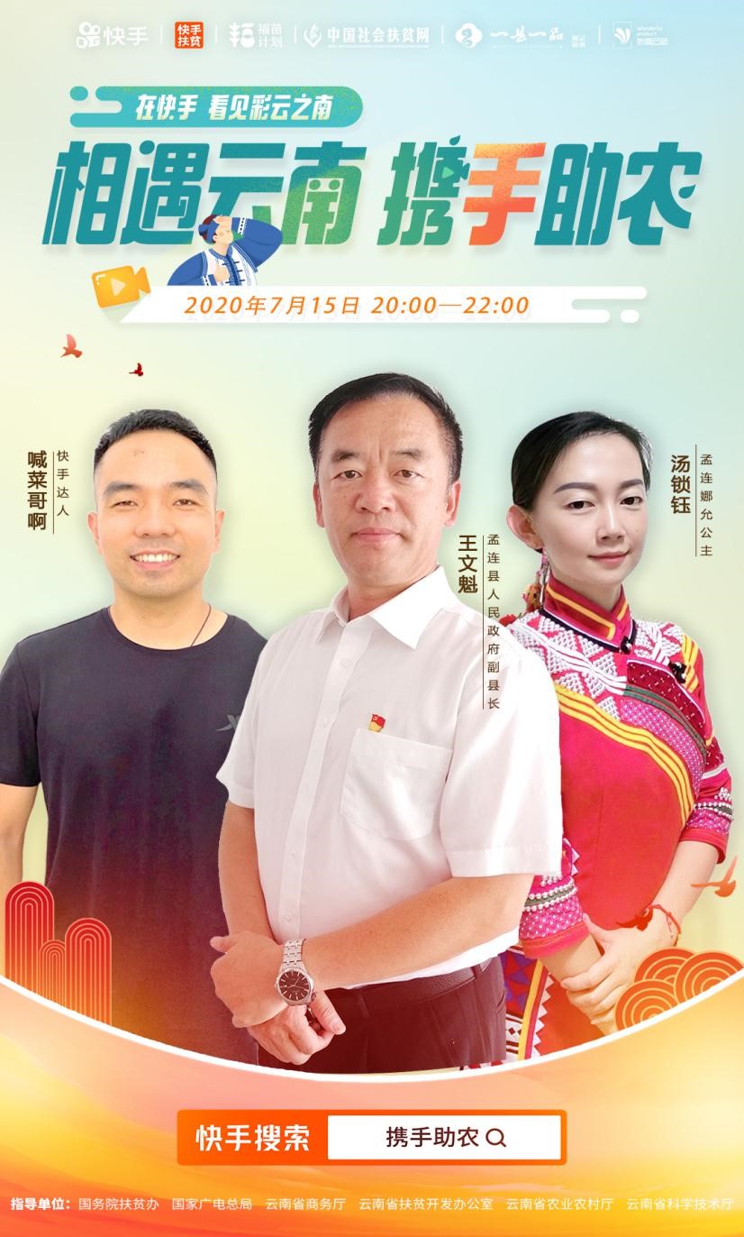 由快手主辦的“相遇雲南 攜手助農”活動7月15日20點至22點正式走進雲南省孟連縣。孟連縣人民政府副縣長王文魁向全國網友推薦雲南當地優選好物。此次活動在國務院扶貧辦,國家廣電總局,雲南省商務廳、雲南省扶貧開發辦公室,雲南省農業農村廳,雲南省科學技術廳的指導下,由雲南妙趣雲品電子商務有限公司承辦,以快手直播及各大快手頭部主播為載體,快手APP直播主會場、直播頻道等為主要引流方式,通過電商脱貧直播,探索快手公益直播新模式,在公益直播中,宣傳孟連縣特色農產品,旅遊文化,民族文化,帶動當地產業升級,實現精準扶貧。