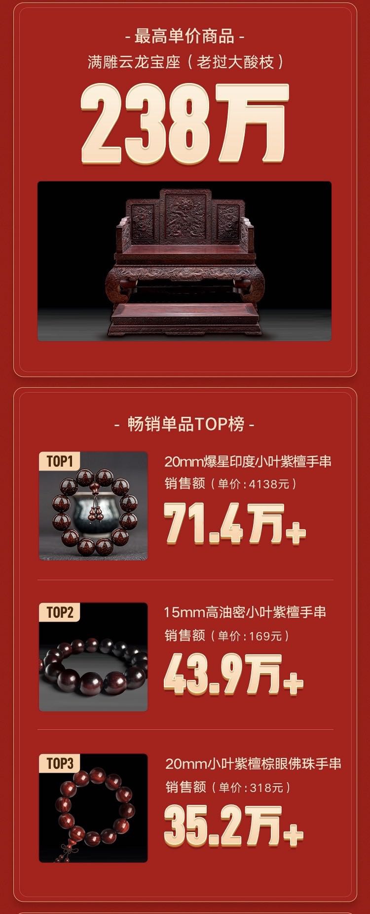 數據顯示,此次紅木節活動的銷售額超過1205萬,訂單總量超8.4萬單,累計觀眾數388萬+。其中售出的最高單價商品為238萬元的滿雕雲龍寶座(老撾大酸枝),該商品因明星成龍慈善晚宴一拍成名,又被稱為“成龍寶座”。