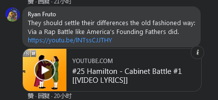 網友Ryan Fruto“建議”:“他們應該用老式的辦法來解決分歧:就像美國的開國元勳們一樣,進行一場説唱戰。”↓