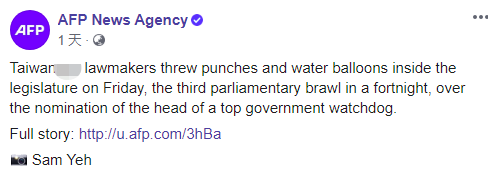 法新社臉書寫道,週五,台“立委”在“立法院”內揮拳打人還投擲水球,這已是兩週以來第三次“立法院”內鬥毆事件,起因是有關監察機構負責人的提名。
