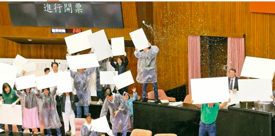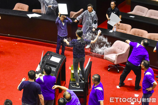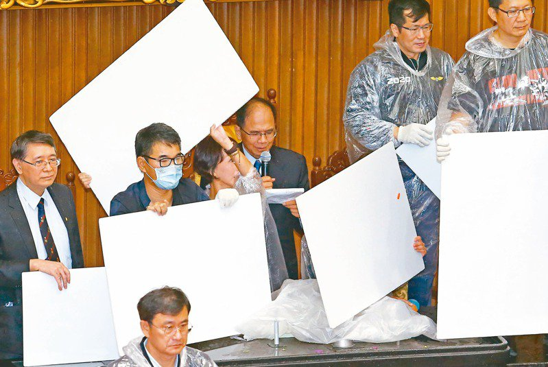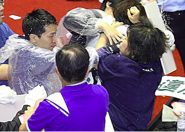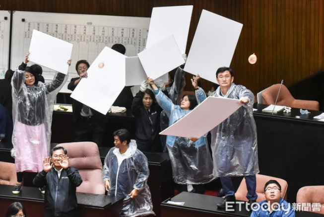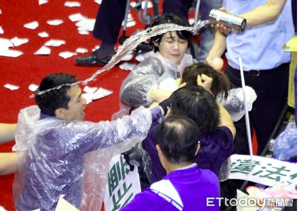 投票時,中午12點左右,國民黨“立委”拿出預藏好的水球丟向主席台,民進黨“立委”則舉起白色厚紙板、穿上雨衣“備戰”。