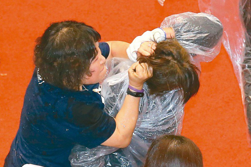 其間,國民黨“立委”葉毓蘭雙手拉扯民進黨“立委”邱議瑩的頭髮,其他人趕緊上前將2人分開。