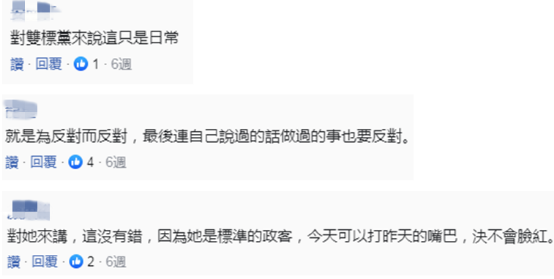 當時有網友批評民進黨稱,“對雙標黨來説這只是日常”;“就是為反對而反對,最後連自己説過的話做過的事也要反對”;“對她來講,這沒有錯,因為她是標準的政客,今天可以打昨天的嘴巴,決不會臉紅”。