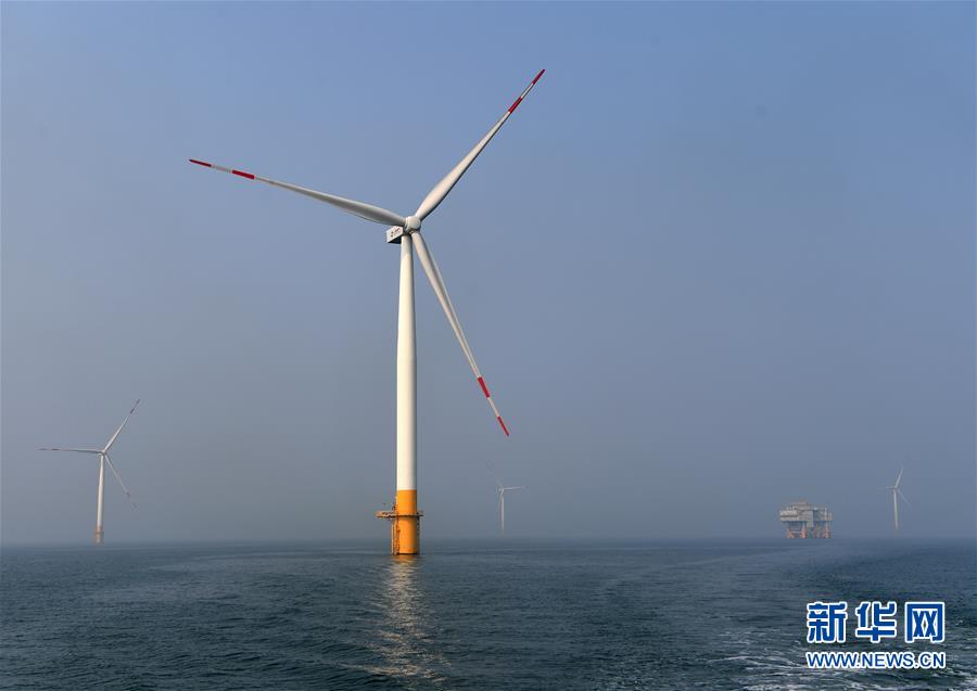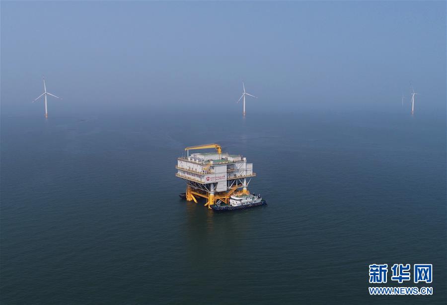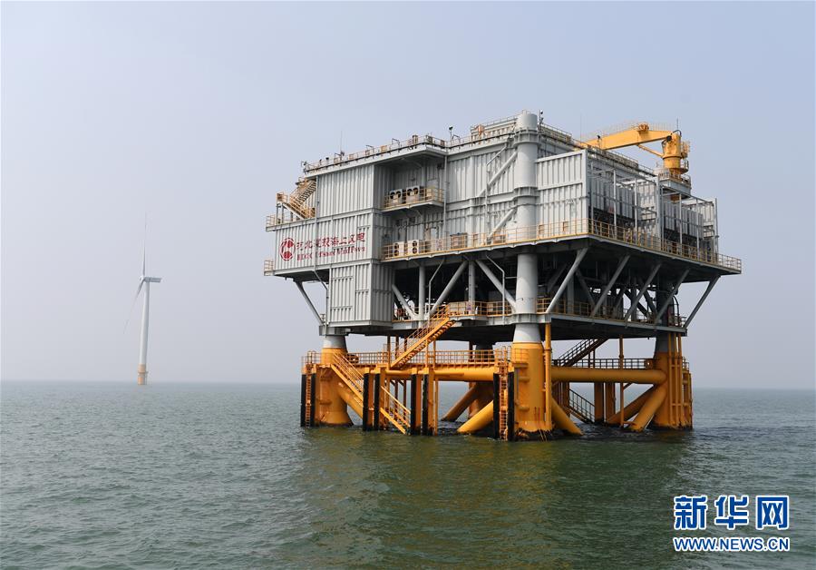 7月19日拍攝的唐山樂亭菩提島海上風電場升壓站。 近日,河北省首個海上風電項目——唐山樂亭菩提島海上風電場全部風機併網發電。該項目裝機總容量300兆瓦,共安裝75台單機容量為4兆瓦的風電機組,預計年發電量7.6億千瓦時。 新華社記者 楊世堯 攝