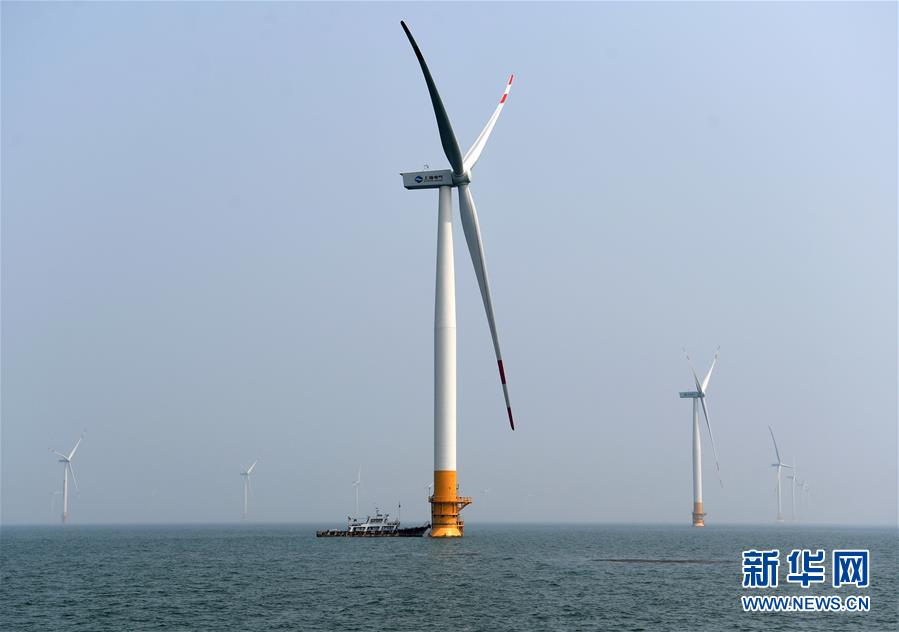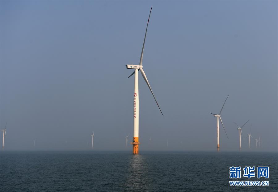 7月19日拍攝的唐山樂亭菩提島海上風電場的風力發電機。 近日,河北省首個海上風電項目——唐山樂亭菩提島海上風電場全部風機併網發電。該項目裝機總容量300兆瓦,共安裝75台單機容量為4兆瓦的風電機組,預計年發電量7.6億千瓦時。 新華社記者 楊世堯 攝
