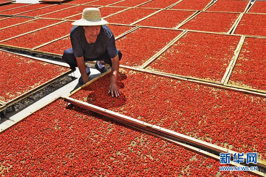 7月19日,在甘肅省張掖市高台縣黑泉鎮十壩村,農民在晾曬枸杞。 在位於河西走廊的甘肅省張掖市高台縣,現在正是枸杞成熟的季節,農民們忙着採摘成熟的枸杞,進行晾曬加工。近年來,高台縣在戈壁荒灘等非耕地上發展特色林果產業,取得良好經濟和生態效益。目前,全縣引進5家企業在戈壁灘種植枸杞面積達2.2萬畝,產品遠銷國內外市場。 新華社發(鄭耀德 攝)